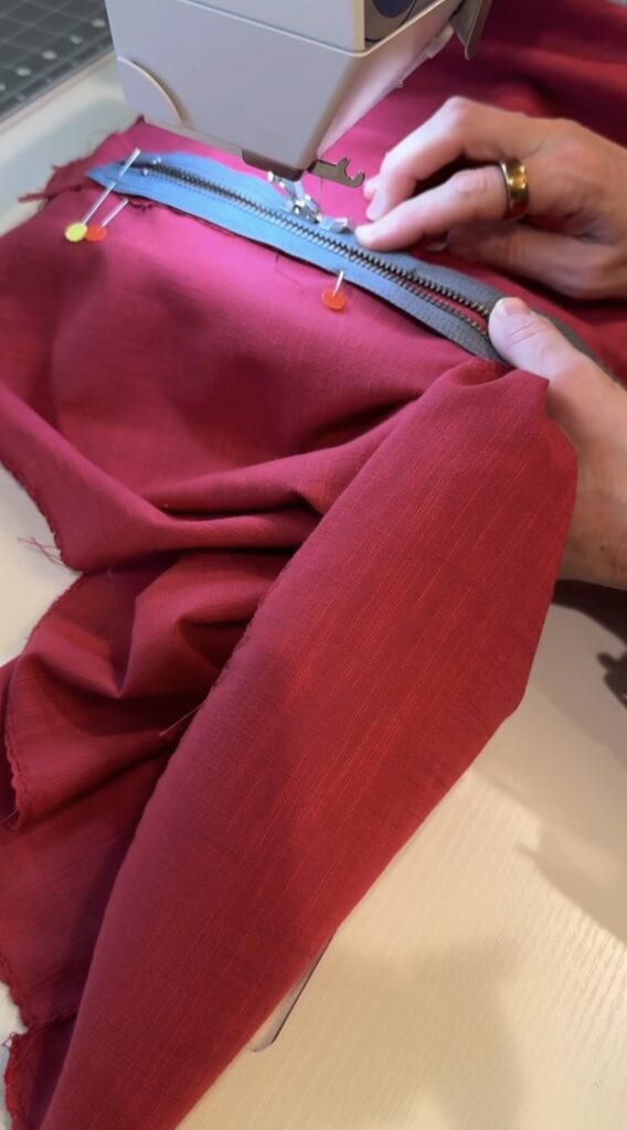 Place the zipper face-down on the seam, lining up the teeth right in the center. Pin in place. Switch to your zipper foot, move the needle slightly over, and sew about halfway between the teeth and the edge of tape. This placement gives a professional finish. When you reach the zipper’s metal stop (or the end), don’t sew over it. Lift the foot, pivot, and press onward. Then use your seam ripper to open the basted portion and reveal the zipper.